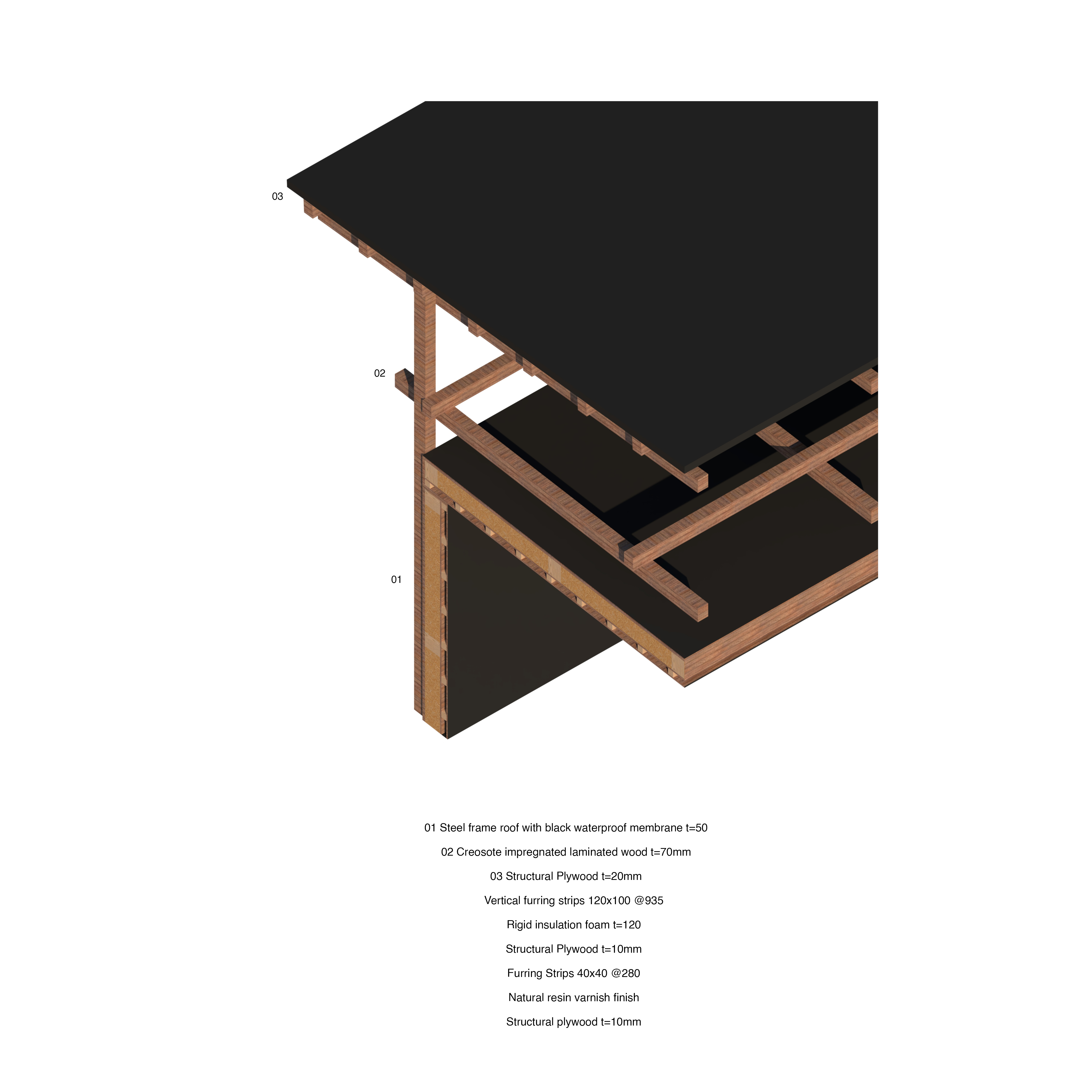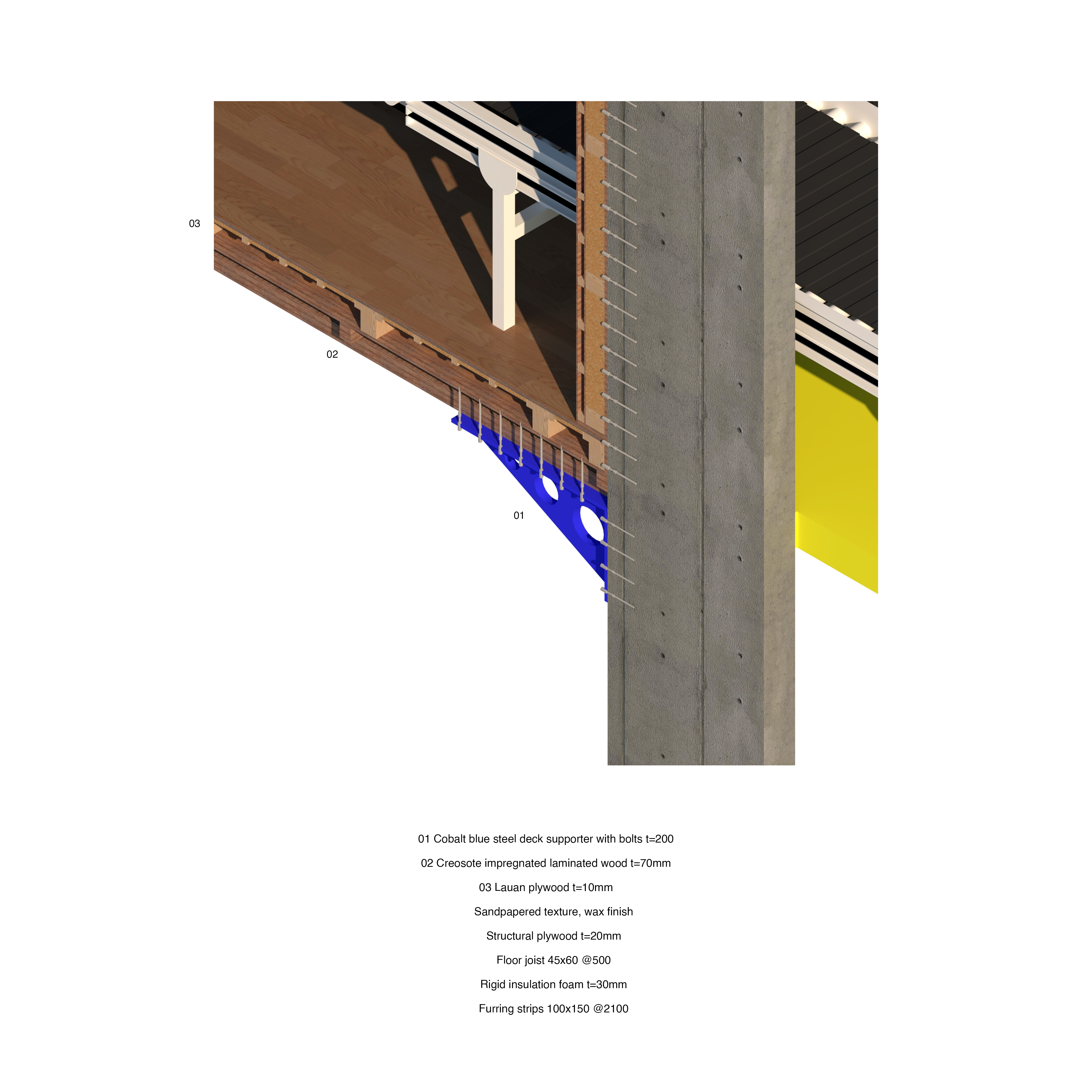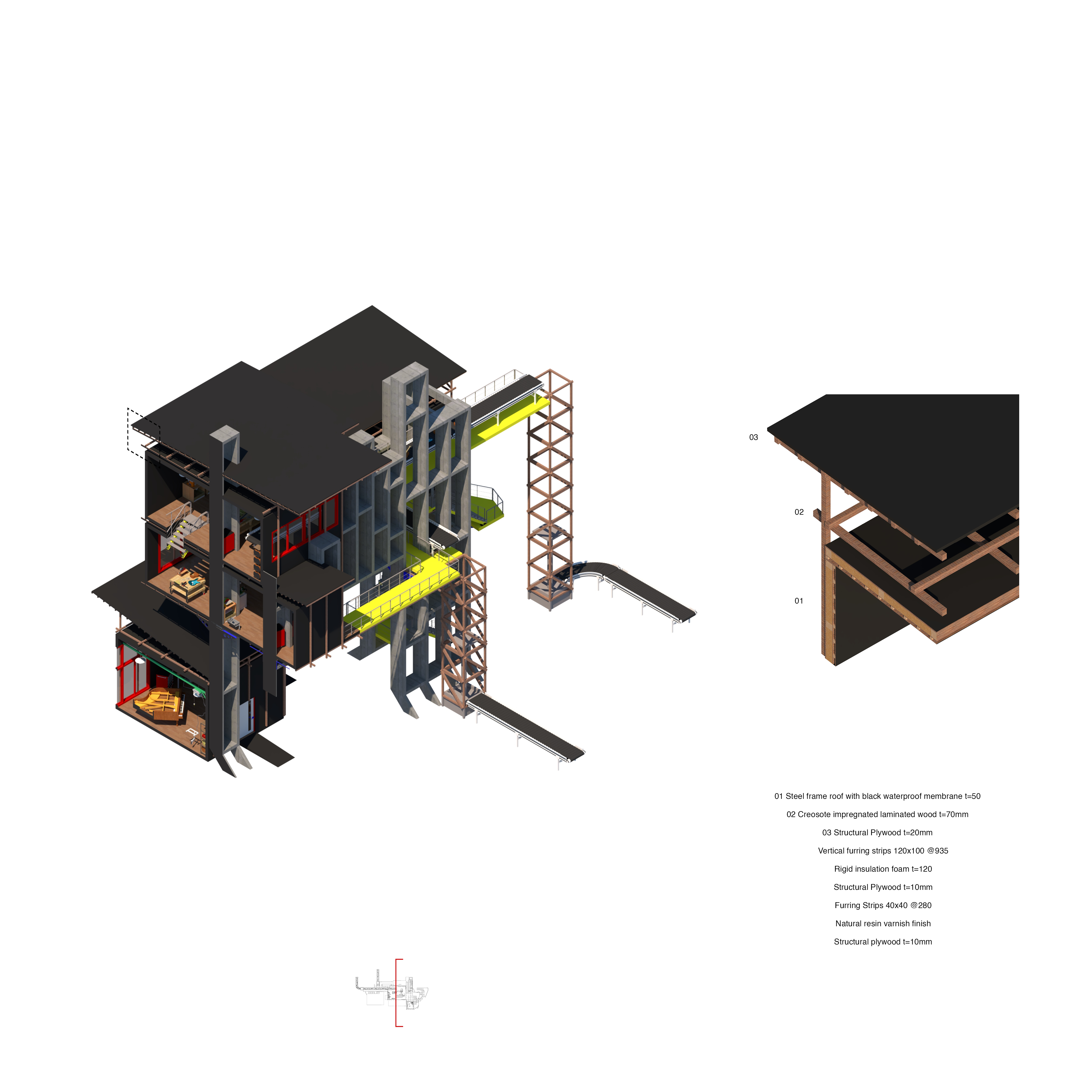 Apart from the main concrete structure, all workshops consist of wooden materials. As the details are shown in two 3D sections, the workshops are pre-fabricated structures like an instrument, and these are stood by triangles supporters.
