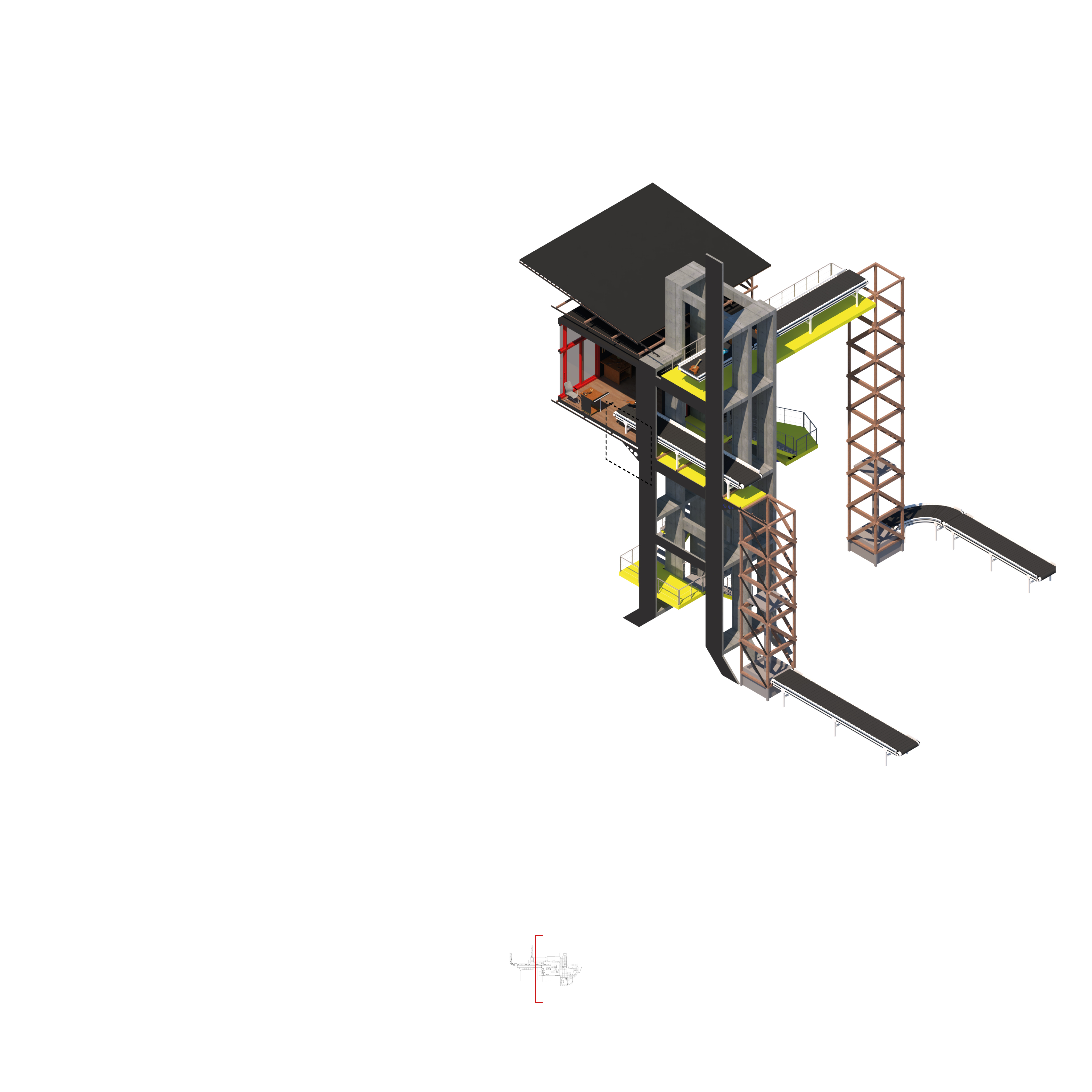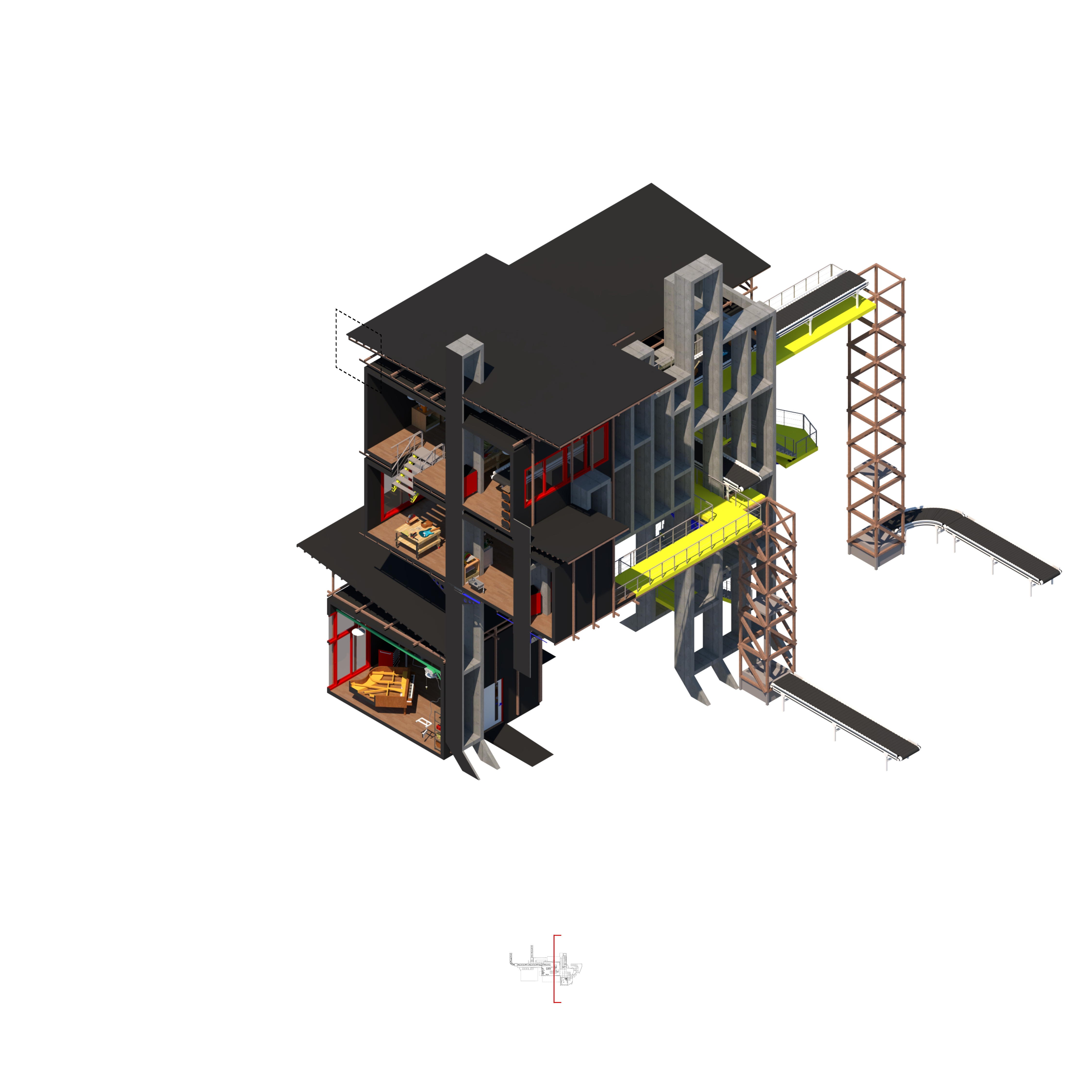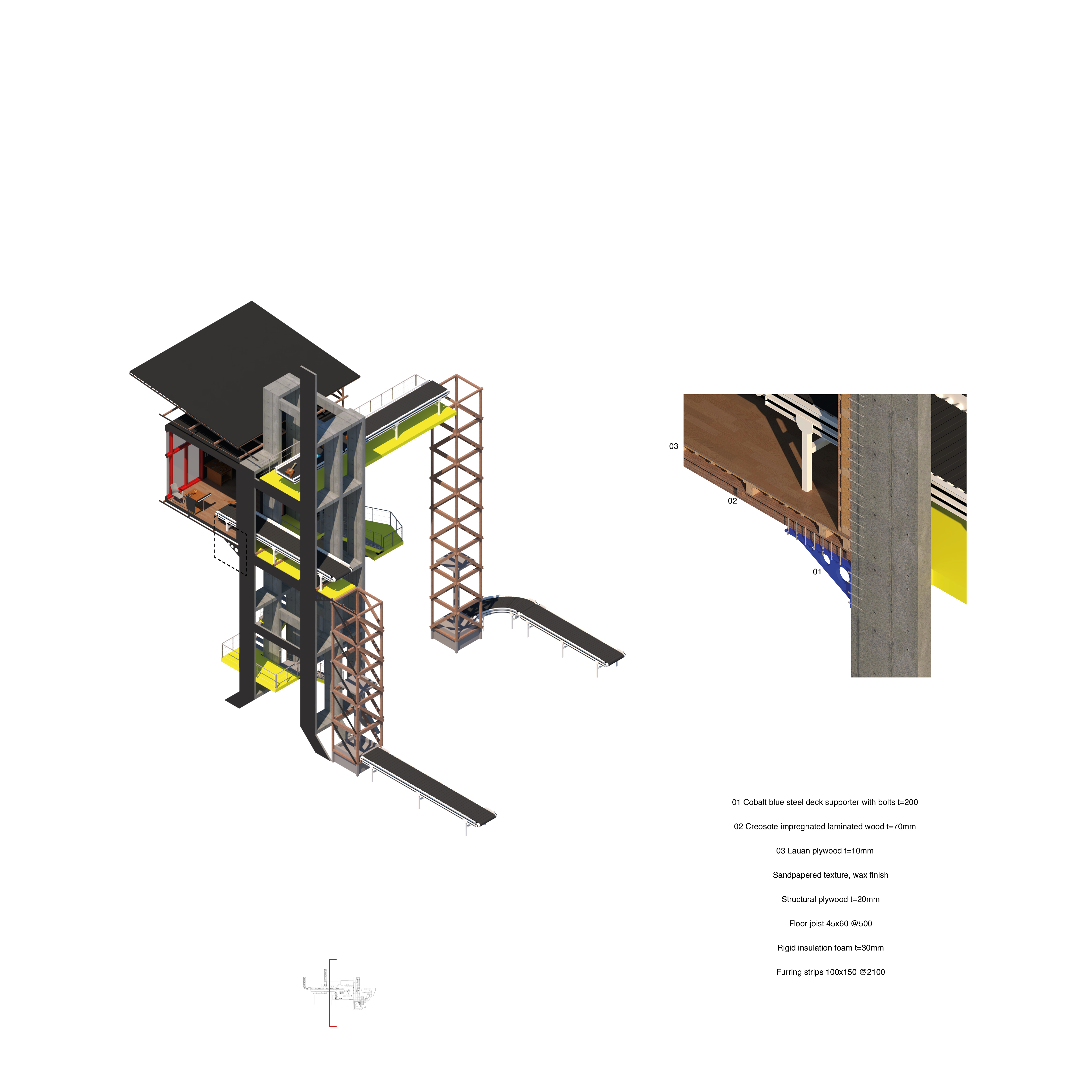 Apart from the main concrete structure, all workshops consist of wooden materials. As the details are shown in two 3D sections, the workshops are pre-fabricated structures like an instrument, and these are stood by triangles supporters.