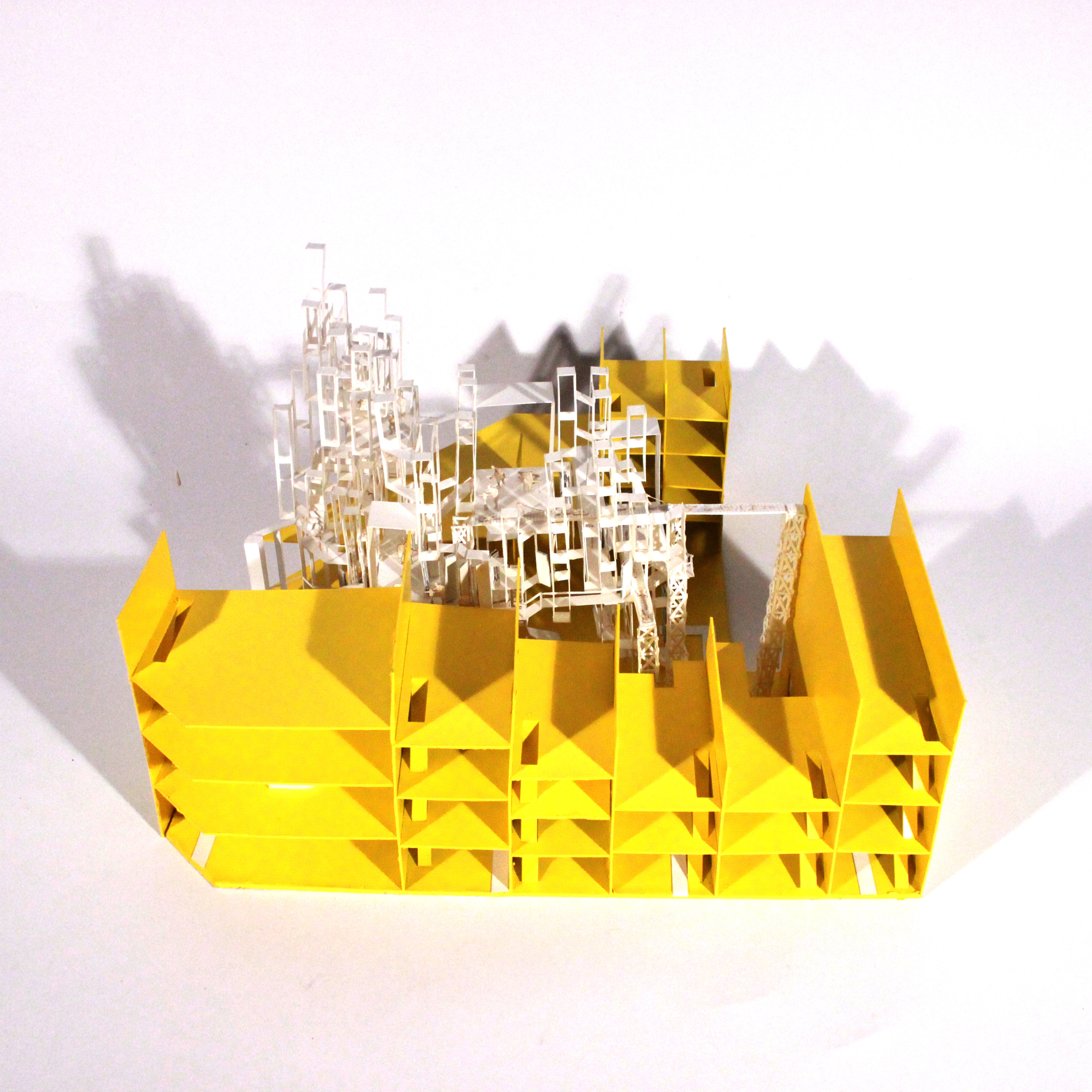 The project conceives an urban strategy that is based on discovery, fantasy, temporariness, and mobility. The project invents a building that opens up an existing courtyard and teases out an imaginative and delicate relationship between inhabitable structural fins, a variety of musical instrument repair workshops and rehearsal spaces and the existing urban location within Soho. It speculates on a new theatrical landscape as a way of attracting the local community to sound and music.