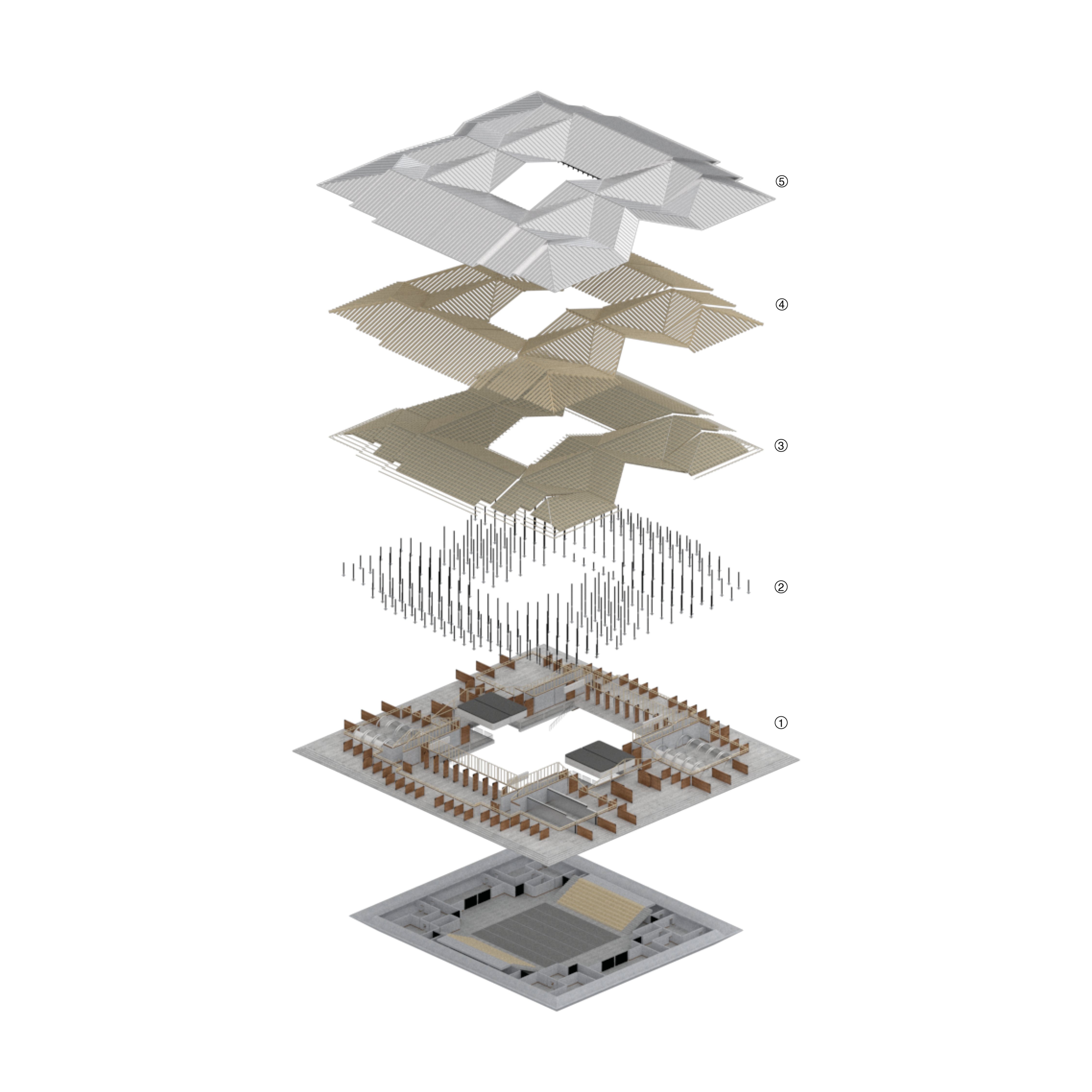 The K-POP Learning Centre consists of a concrete foundation, cross-steel columns, Korean pine timber beams, and an aluminium roof structure. The columns are more densely arranged at the edge by creating void space in the centre of the project for K-POP music performance. A concrete foundation secures the columns robustly, and the columns support the timber roof frame and aluminium roofing.